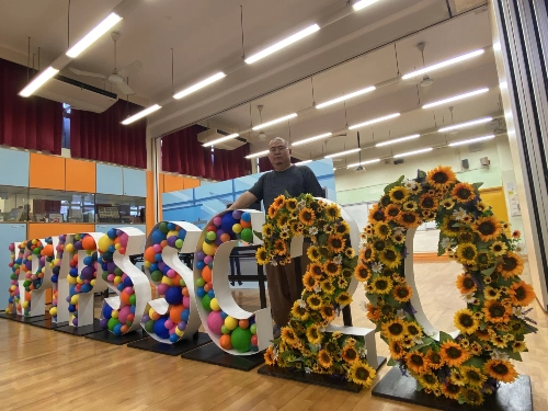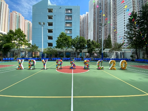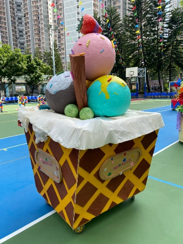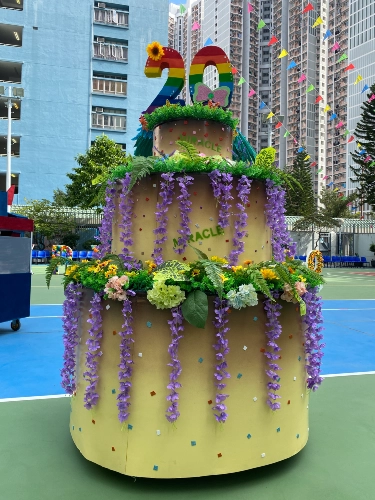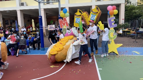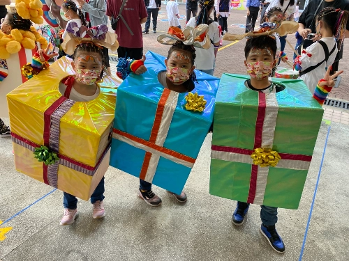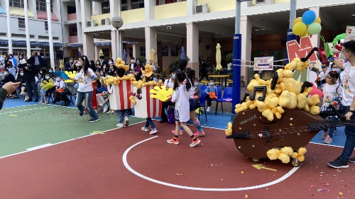 校慶活動當日全校的學生、老師及校長一同於學校的操場上進行了一場精彩的大型花車及舞蹈巡遊。